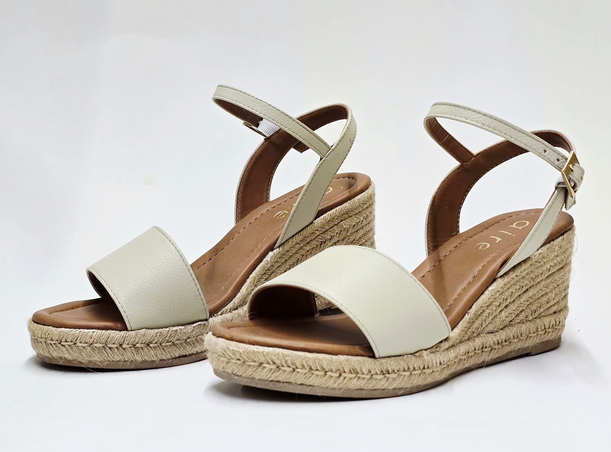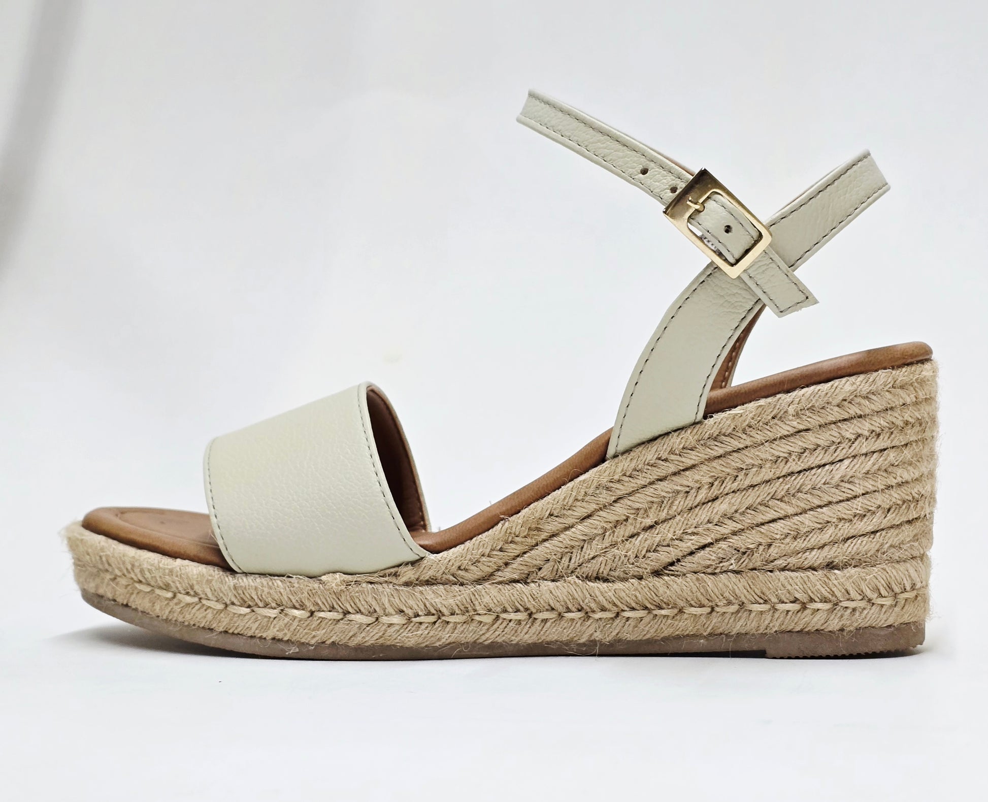 Alpargata femenina confeccionada en piel premium tonalidad Latte, diseñada con puntera y talón descubiertos para máxima ventilación. Cierre de hebilla ajustable garantiza un calce seguro y personalizado. La estructura combina plantilla de piel con cuña de yute que proporciona 6 cm de altura en el talón y 2 cm en la delantera, creando una silueta elegante y cómoda. Base de suela en hule antideslizante ofrece tracción confiable en diversas superficies. Se recomienda seleccionar la talla habitual; si se encuentra entre dos medidas, opte por la mayor para un ajuste óptimo.