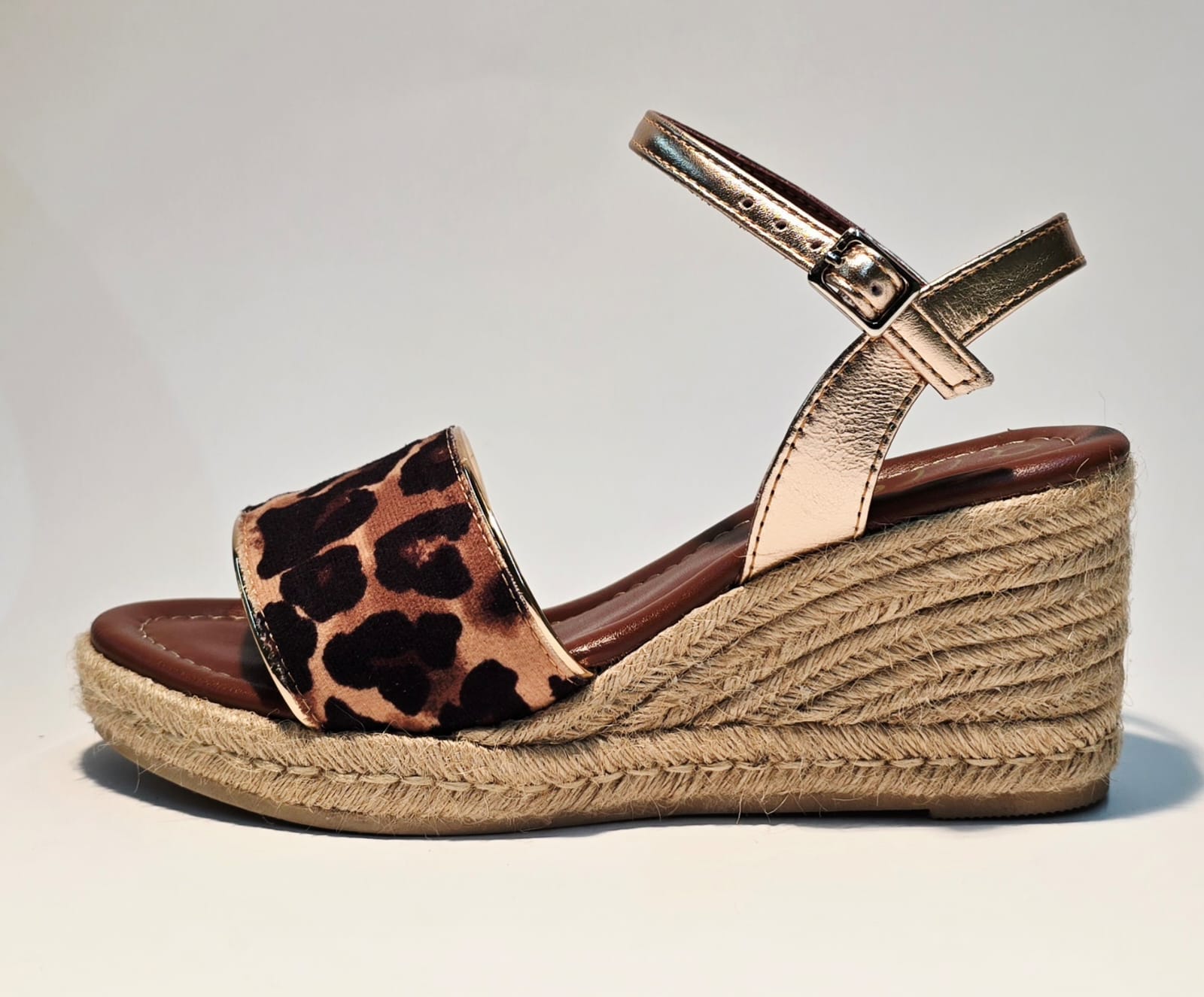 Esta alpargata femenina está confeccionada en tejido animal print Leopardo y presenta un vivo decorativo en el borde del corte que realza su diseño. Cuenta con punta y talón abiertos, además de un cierre con hebilla para un ajuste seguro. La plantilla es de piel, mientras que la cuña de yute mide 6 cm en el talón y 2 cm en la parte delantera. La suela tiene base de hule antideslizante para mayor estabilidad. Este modelo corresponde a la talla habitual; si dudas entre dos tallas, se recomienda elegir la mayor.